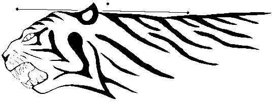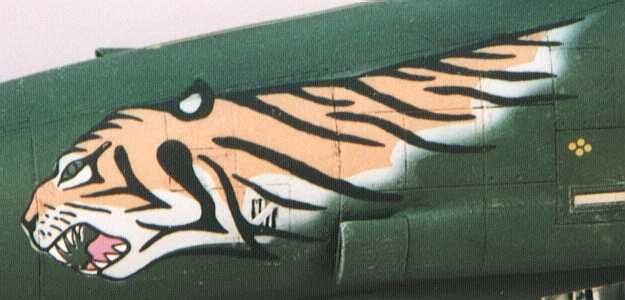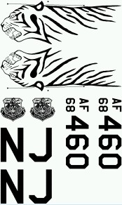 To the right is the full image I printed on my laser printer. To create the full color tiger heads, I carefully masked the full color portions of the tiger heads on the nose of the F-4 model using frisket paper. I traced the shapes I needed to cut in the frisket directly off the tiger decal I had printed. The dots and line in the image, just above the tiger head, were used to align the masks on the model. These alignment marks coincide with panel lines on the model. After the painting was completed, I applied the black-only outline decal over the color areas to define the finished marking. The results speak for themselves.