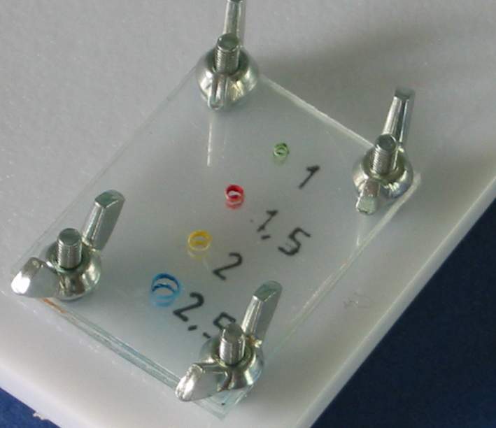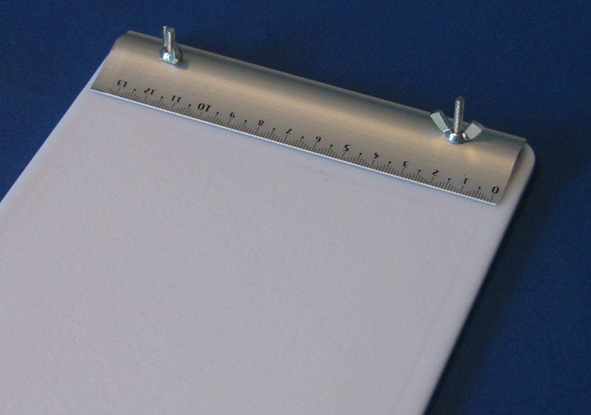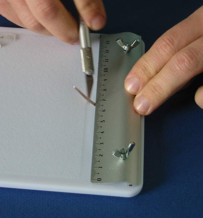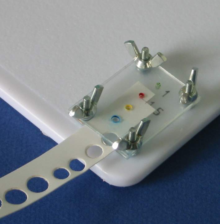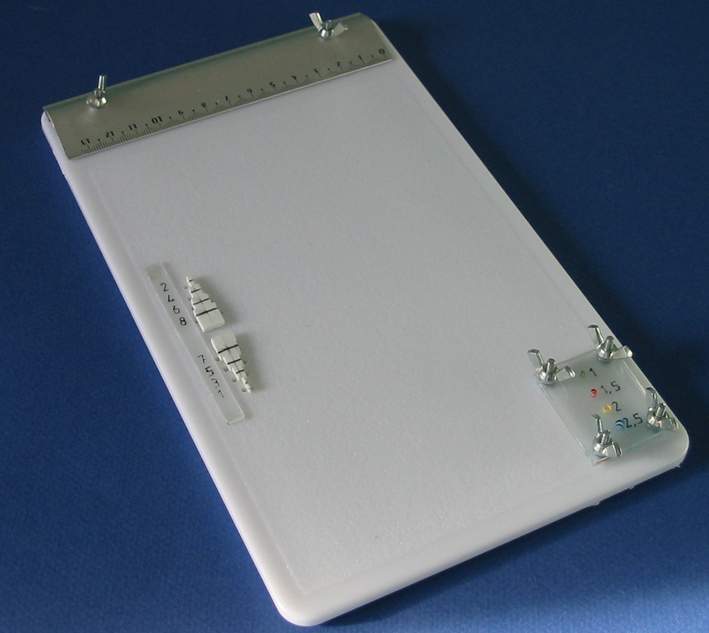 I ) Le plieur de photo découpe J'ai utilisé comme base ma planche à découper qui viendra supporter tous mes "outils". J'ai recoupé ma règle d'écolier à la longueur voulue soit 14 cm La règle est de forme légèrement bombée ce qui permettra en appuyant à l'arrière de soulever facilement la règle pour y coincer la pièce de photo découpe. Elle est percée en 2 endroits pour recevoir 2 vis avec leur écrou papillon afin de faciliter son blocage. Et voila de quoi plier facilement des photo découpe ou des feuilles d'alu etc. II ) L'emporte-pièce maison. Histoire de couper facilement des rondelles de carte plastique voici un petit emporte-pièce maison pour des diamètres de 1, 1.5, 2, 2.5 mm. Dans une feuille de plexiglas: on découpe 2 plaquettes de 3 x 4 cm A l'aide d'un trace cercle on dessine les trous destinés à recevoir les vis ainsi que les trous de perçage. On scotche les 2 plaquettes sur la plaque de base pour effectuer le perçage Et voici notre ensemble prêt à être monté. Les vis sont des vis de 30 x 25 Les 2 rondelles par vis servent à récupérer le disque de plastique une fois découpé. Première plaquette Une rondelle d'entre toise pour faciliter la manipulation de la plaquette La deuxième plaquette est posées le tout sera maintenu par 4 écrous papillons. Afin de faciliter le perçage j'ai repéra mes différents diamètre par des couleurs et un petit marquage ( pour faire pro !!!!!) Et les couleurs correspondent à mes emporte-pièce maison à savoir des rivets dont le bout à été coupé. Pour faire un disque il suffit de passer une bande de plastique entre les 2 plaquettes serrées l'une à l'autre et de découper à l'emporte pièce III ) Le "plieur de poignées" Pour pouvoir plier aisément du fil de cuivre ou des feuilles d'alu etc. pour fabriquer des poignées je me suis fabriqué des gabarits. Je suis parti d'un profilé plastique ( 2.5 x 40 ). J'en ai coupé 2 morceaux que j'ai collé l'un à l'autre Sur premier morceau j'ai fait les gabarits impairs ( 1 , 3 , 5 et 7 mm ) tout les 5 mm et sur le deuxième morceau les gabarits pairs ( 2 , 4 , 6 et 8 mm ) Et pour repérer mes gabarits, j'ai collé à côté une réglette pour indiquer la taille des poignées. Le pliage se fait facilement