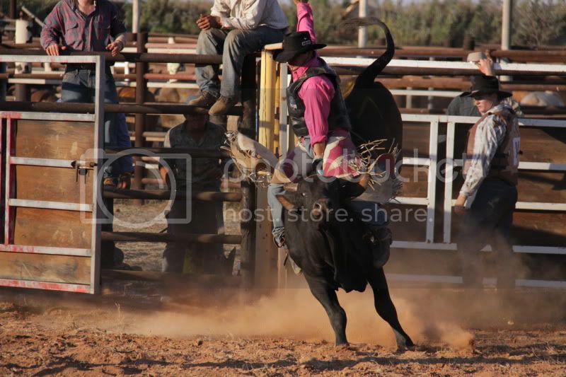 Mine is a photo from the Onslow rodeo last year taken by a workmate . We are drilling on the site of a future gas proccessing plant in a fairly remote part of Western Australia . We got the day off work to go to the rodeo as reward for 50000 hours worked with no lost time injuries . Had a great day , I like the action and the looks on the faces in this photo .