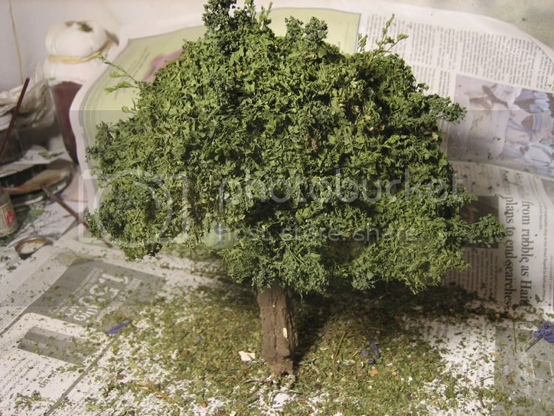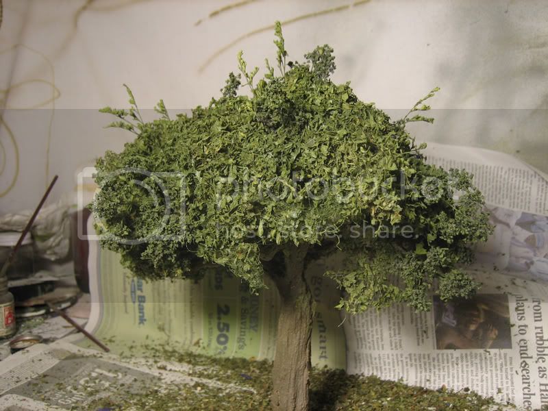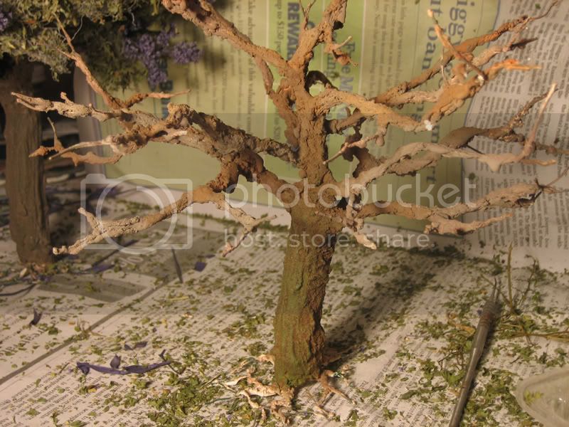Eric, some good looking trees there . When I make wire trees I usually get the thick crazy glue and coat the tree and limbs with it. Just helps to streagnthen it. I then use a mixture of testors putty and liquide glue and make a mixture like paste. This I brush on all over, let it set and then using an old brush I add streaks up and down and through out the tree. It seems to give it a solid base that doesn't crack apart as you work in your funace filter for the smaller branchs. Paint and add your leaves and crown your self as mother natures helper. If you caught my vignett ( through the valley of death ) you'll see what I accomplished with this method. I also shaved bark from a large branch and glued it to a partialy submerged tree in that vignnet. Hope this is of some help. bob d.