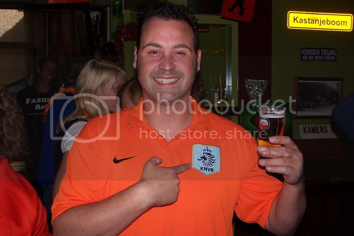 What I always like with soccer is the fact that here in Holland suddenly everything turns orange. Everybody starts to wear orange, Supermarkets, beerbrands, Foodproducts, cellphonecomapnies, big shops etc all give away orange goodies to wear and show during the time the Dutch are in the Championship. Rendering everything useless as soon as the Dutch fly out. But regardless of the result the fans always are behind their country. I found a folder with pictures that I took during the Match against France in the European Championship when we beat them with 4-1. Take a look at all the paraphernalia worn and mostly the huge difference among them. Or look at how the bar looks for that matter.