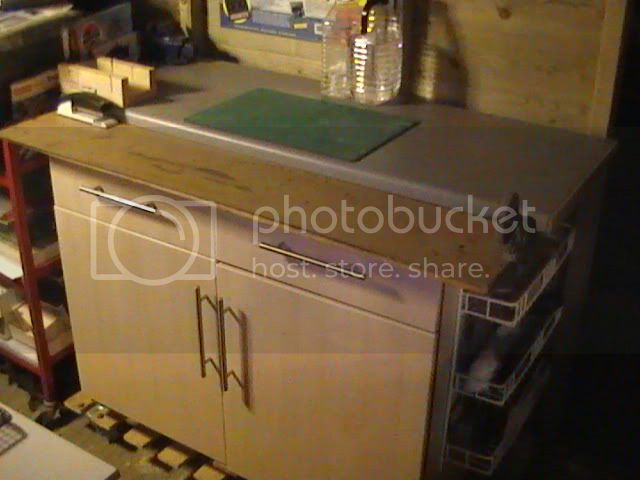 This worktop sits on top of a stiff board to give a good solid straight edge that work can be set off against.