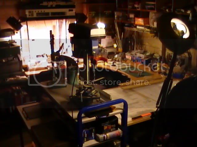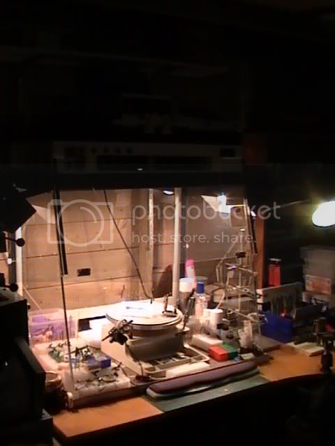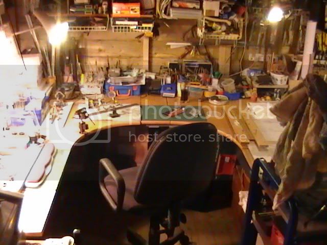 The main workstation is made up of 800 wide desks in a U shape with the left side taken up with the fume cupboard sitting on top now vented out through the shed wall for spray painting. There are two pairs of lights hung either side to illuminate the fume cupboard