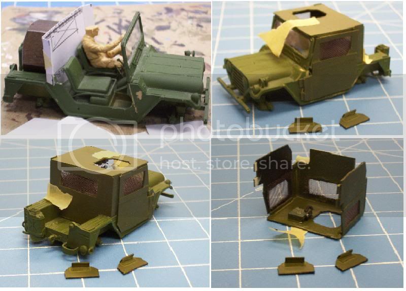 It's a simple hard cab design. The cab is designed to be removal to allow access to the interior later on. The construction was pretty straightforward. I used card stock to work out my templates. I left the rear open mainly to avoid looking too much like the existing Academy hart top Mutt. The driver is the kit figure and he was used to check the height of the cab. I added a radio and made a reciever and coiled cord out of wire.