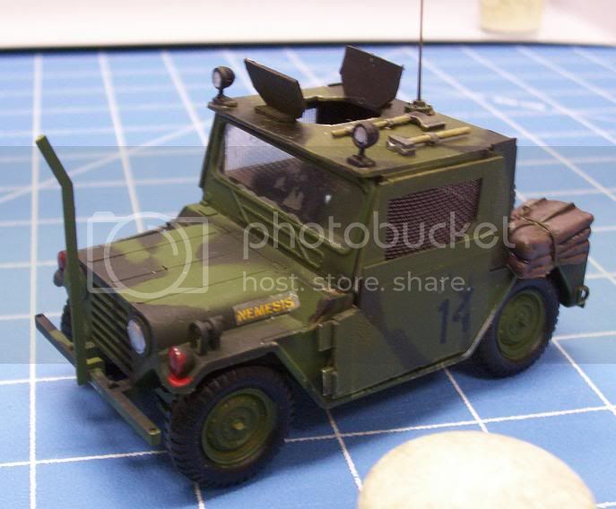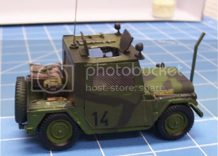 Two finished shots. Note the mesh side and rear windows, stowage in the rear, and tools strapped to the top. I really don't remember what color paint I used and I am colorblind. I masked and oversprayed with standard black for the camoflage. Decals came from the spares.