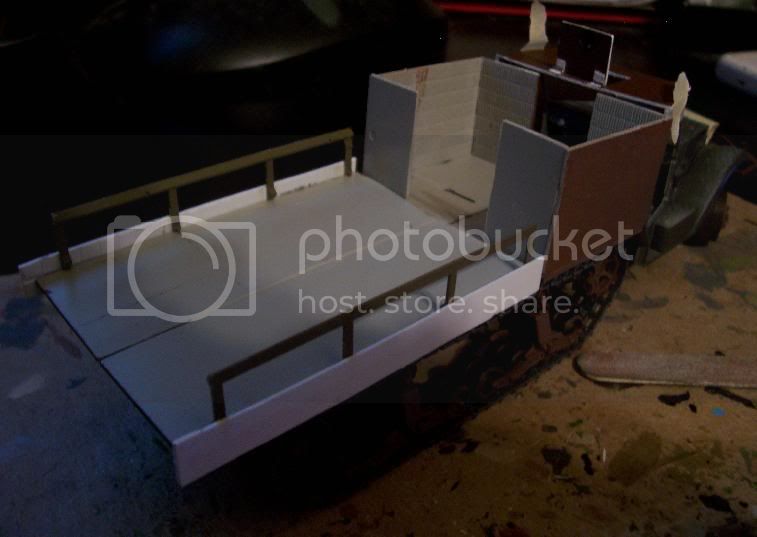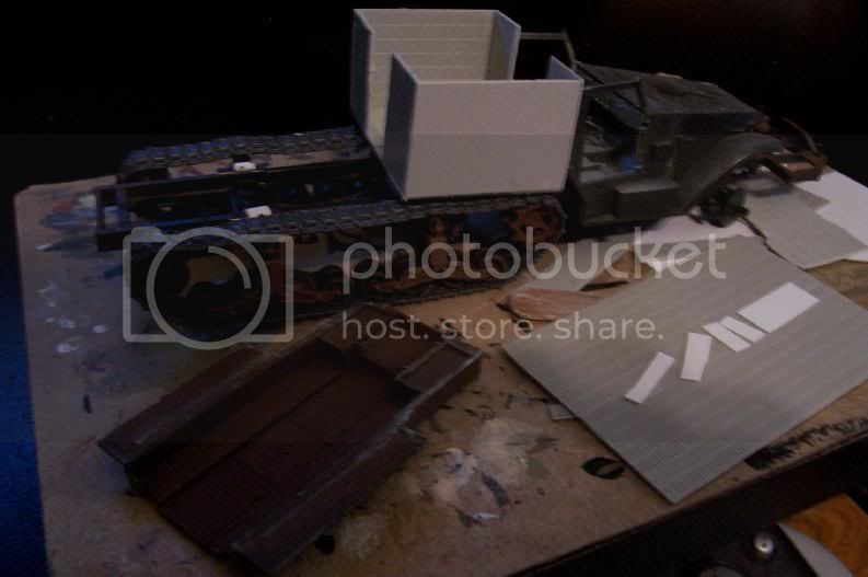 Originally, the track was going to be a trade and salvage vehicle. I changed it to a salvage and wrecker vehicle. I stretched the kit frame and doubled the M3 running gear. I decided to use a flatbed with a small area set aside for a the crew to store their tools and work. Originally the work compartments was going to be enclosed but that left a vehicle with a high profile. I cut down the kit bed and kept the bottom to mount the flatbed on. Can anyone identify where I sourced the gray styrene?