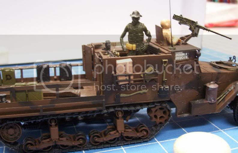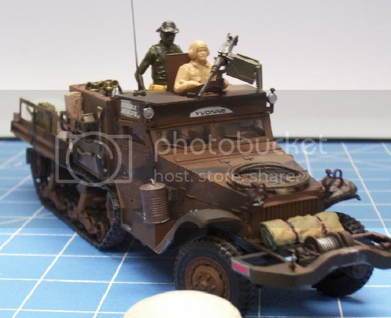 So let me mask off a few areas and give it a quick spray of black. Here's a variety of shots of the finished halftrack. For some shots I added some figures to demonstrate size. Once I decide on how I'll display the vehicles I'll probably work up some crew figures and do some serious weathering. Decals came from the spares. Double Deuce II for the vehicle name and Yvonne maybe in tribute to a lost loved one. You can see some of the added details.