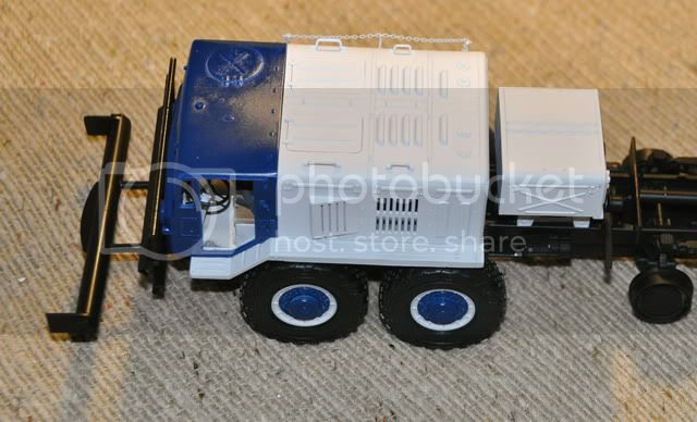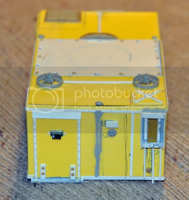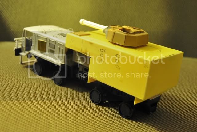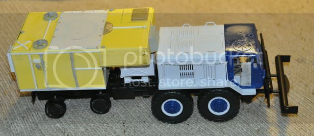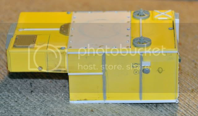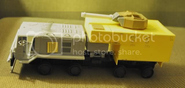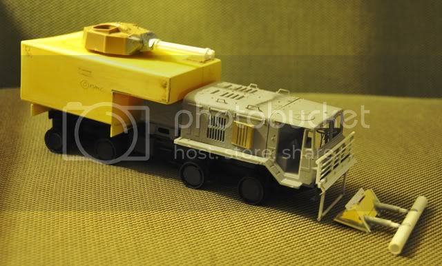 Still lots to do, esp on the weapons pod. I had originally wanted to add a tank turret and while a T-80 turret looked great, turning it sideways made it somewhat awkward looking. I had a spare BRADLEY and LAV-25 turrets but they didn't look right. I didn't have two spare BRDM-2 turrets which would have been spiff, so I added a spare WARRIOR turret and retro-fitted a six barrel 40mm gatling gun. The turret will not have most of the add-ons, just want it bare and simple. I think I may go with GRIZZLY style weapons ports on the sides and rear (think B-17). Still debating on whether or not I should add screen to the cabin and what to do from the cabin back for what anti-zombie measures to add. AND I still have to figure out the details on the pod ....