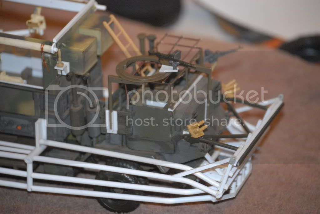Progress so far. Basically an M35, the rear body is plastic card with an upturned truck bed as the roof/upper sides to illustrate the 'home brew' nature of these trucks. I won't be cleaning up edges etc so that they look flame-cut. Armament is the mortar in the roof and a .50 with home-made mount. Colour will be a concrete grey/brown camo.