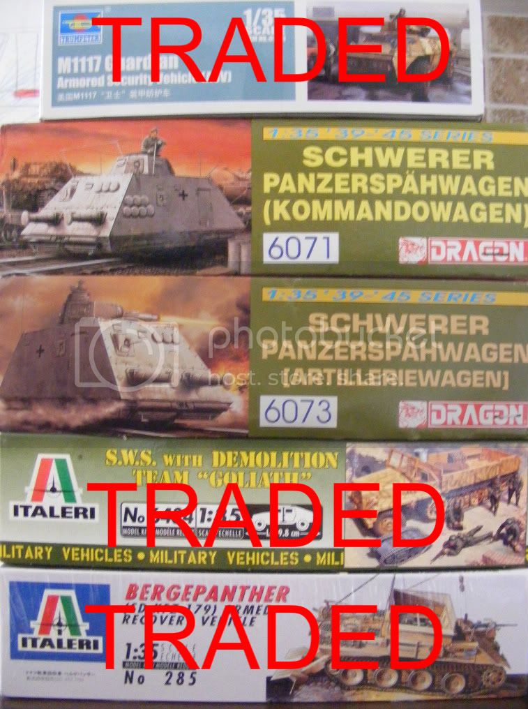 I have the below pictured kits for trade (or if you would prefer, for sale). I would like to trade for 1/35 Modern kits, especially soviet, but am open to especially the following: