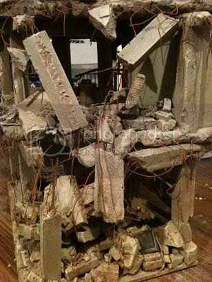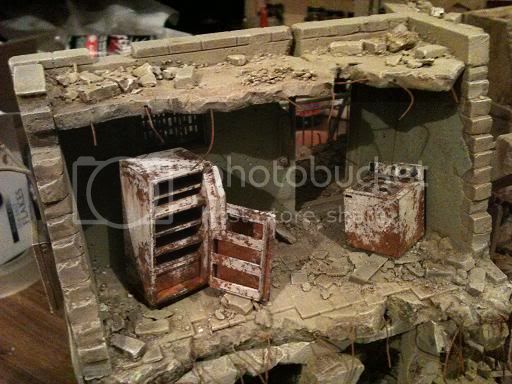Has some trash cans, tv radio fridge washer dryer etc. painted with two part rust patina (real rust) then used salt technique for white overspray, no washes no drybrush.
