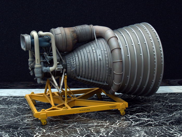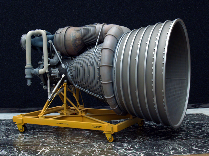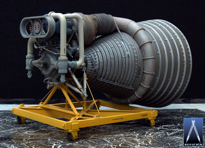 1:20 scale Accurate Models Saturn V - F1 Rocket Engine kit. This is a mixed media kit, made from resin, white metal, and laser cut styrene plastic. Everything is included to build a professional museum-quality representation of one of the most important components of aerospace hardware in history. Includes waterslide decals and complete assembly/painting instructions in .PDF format on CD (for Mac or Windows). This is certain to be the crown jewel of your model collection. This unassembled kit isrecommended for intermediate to advanced modelers. Final model is 12-1/8" long. Yellow display stand dolly shown is included in the kit.