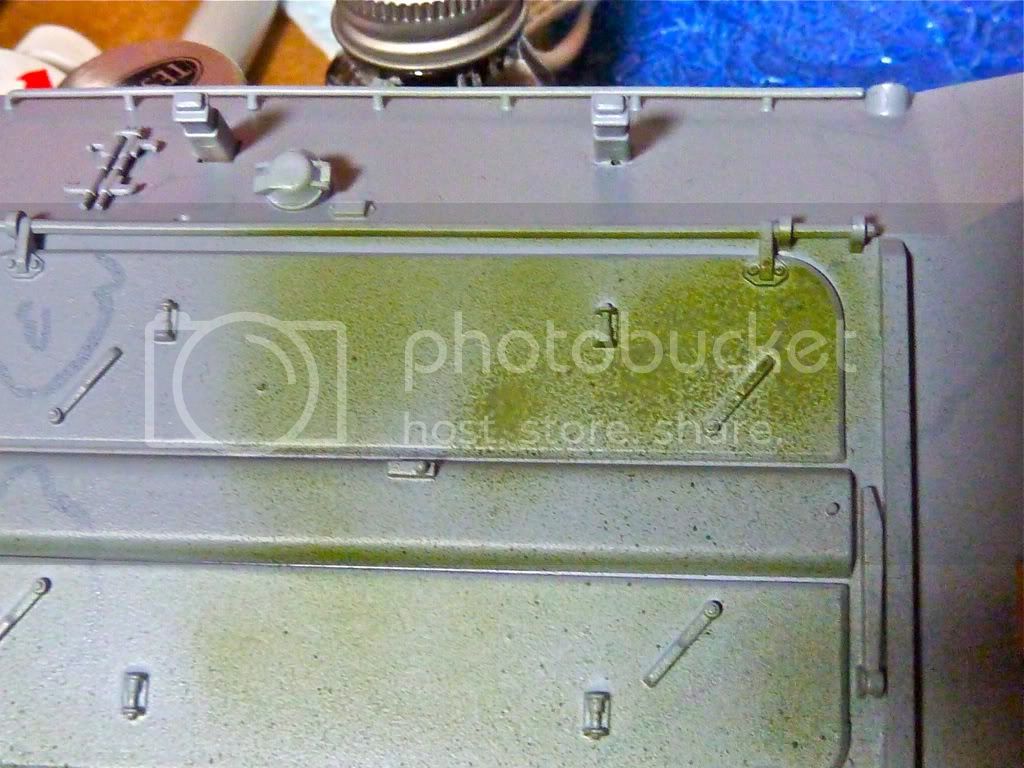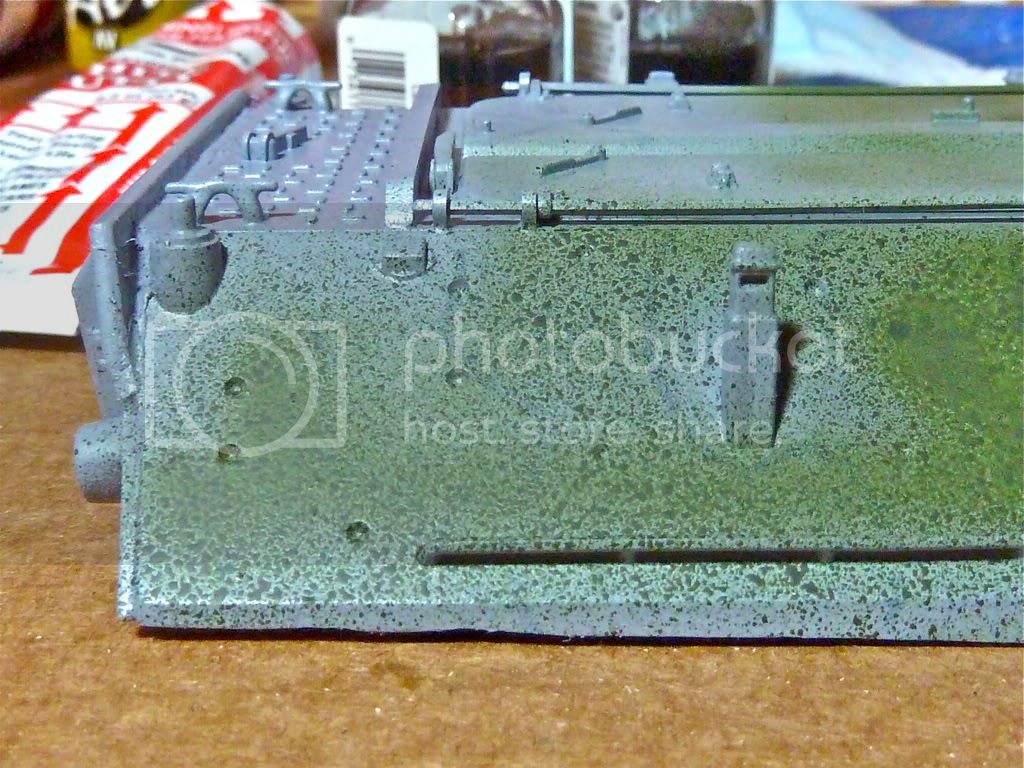 The left half of this shot is Vallejo thinned with rubbing alcohol. At least it adhered to the primer (reliable Testors enamel spraycan), but it looks like it sprays in GIANT flakes, which is how every Vallejo color I bought seems to dry, assuming it will spray at all and stick to the model, which is a very rare occurrence.