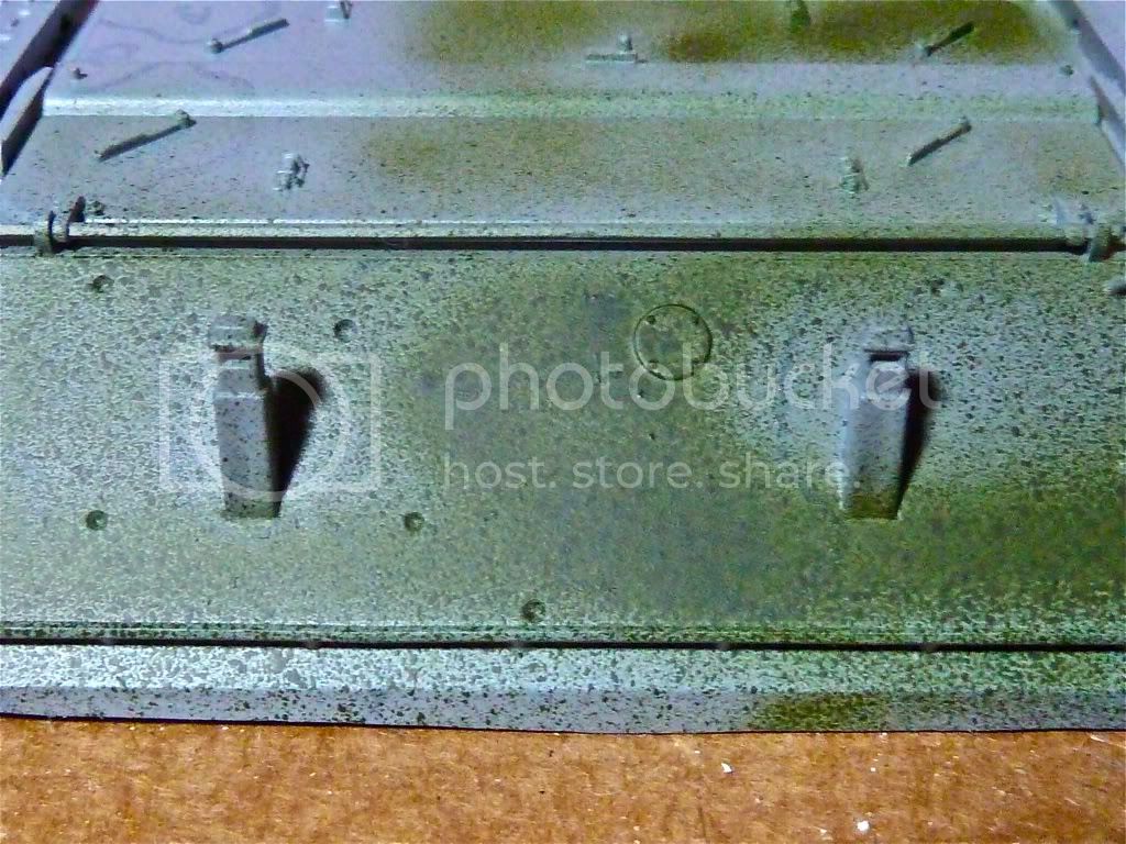 In the middle is Vallejo thinned with distilled water and a drop of dish soap. It sprayed okay, but as you can see, the paint is freckled pretty severely. There is absolutely NO evenness to the coats it lays down and the overspray is tremendous; as I sprayed over that little circle, the paint reached and passed the rightmost post (an air vent maybe? Sorry I don't know the complete anatomy of an AAVP