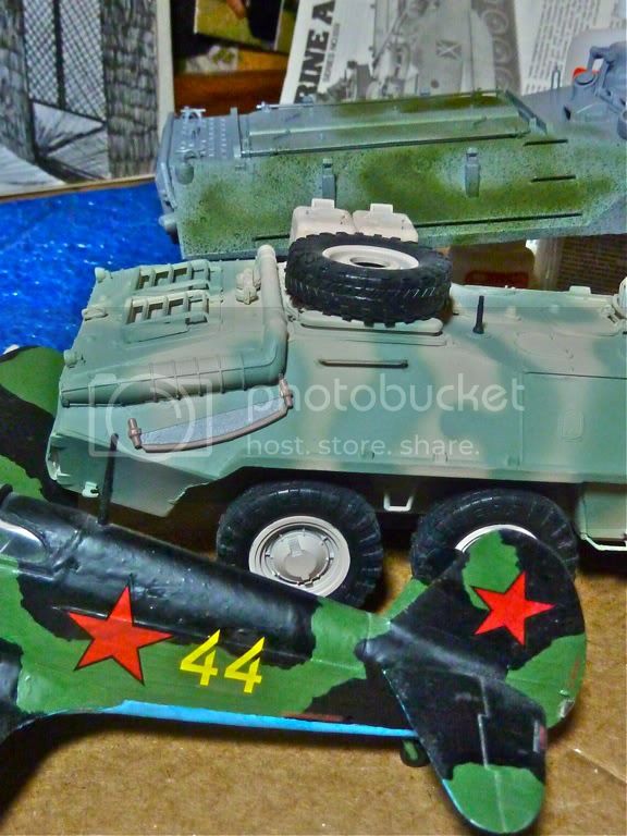 A quick comparison shot: in the foreground is a Yak-1B, handpainted with Testors enamels. In the middle is a BTR-70 sprayed with Testors enamels using a single-action siphon-feed Badger brush. In the back is my truly fantastic AAVP-7A1 with its abomination of a paint job using Vallejo acrylics through an Iwata Revolution. If I can find the patience to make masks for the AAVP, then I'll probably break out the Badger and spray the Toxic-Testors, otherwise I'd like to take a stab at handpainting again. Maybe Vallejo's Model Air can be handpainted, since it obviously isn't meant to be sprayed.