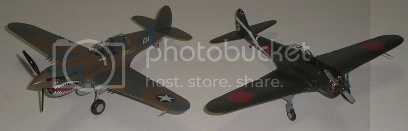 Those are the Hasegawa 1/48 Ki43I in the markings of Sgt. Satoshi Anabuki of the 50th Sentai, 3rd Chutai and the Hasegawa 1/48 P-40E in the markings of Maj. Edward Rector, 23rd FG, 76th FS both CBI late 1942 - early '43. Interestingly Bruce Holloway also flew this P-40 so we've got the high scoring Oscar ace and high scoring American P-40 ace represented (the highest scoring P-40 ace was Killer Caldwell of the desert air force). Both great kits and I'm glad to finish them in time.