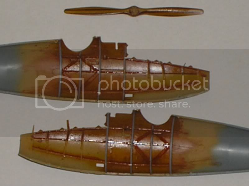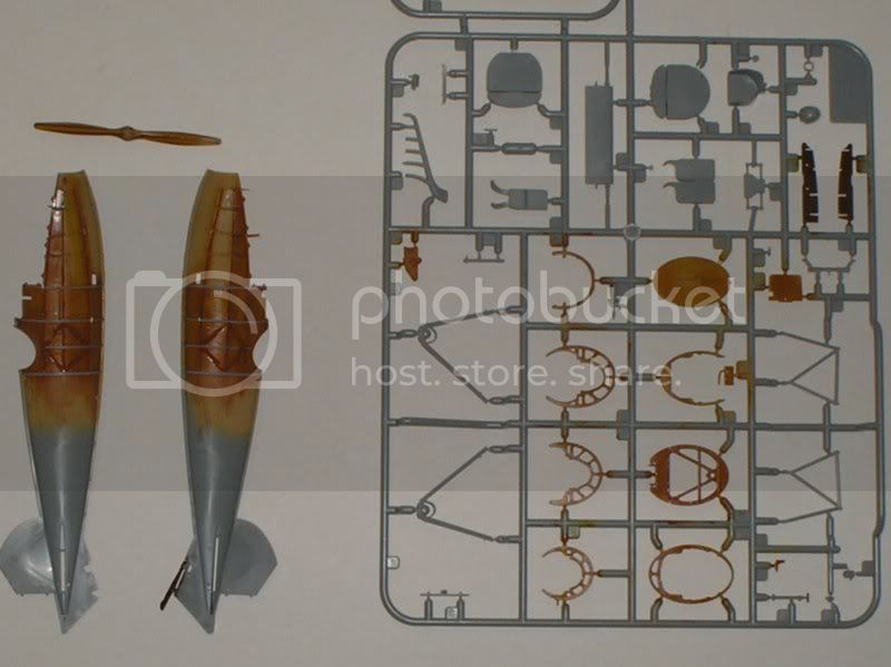 I painted clear orange on the structural members molded to the inside of the fuselage to give them a little contrast. The unfinished areas in the engine compartment will be painted to represent metal panels.