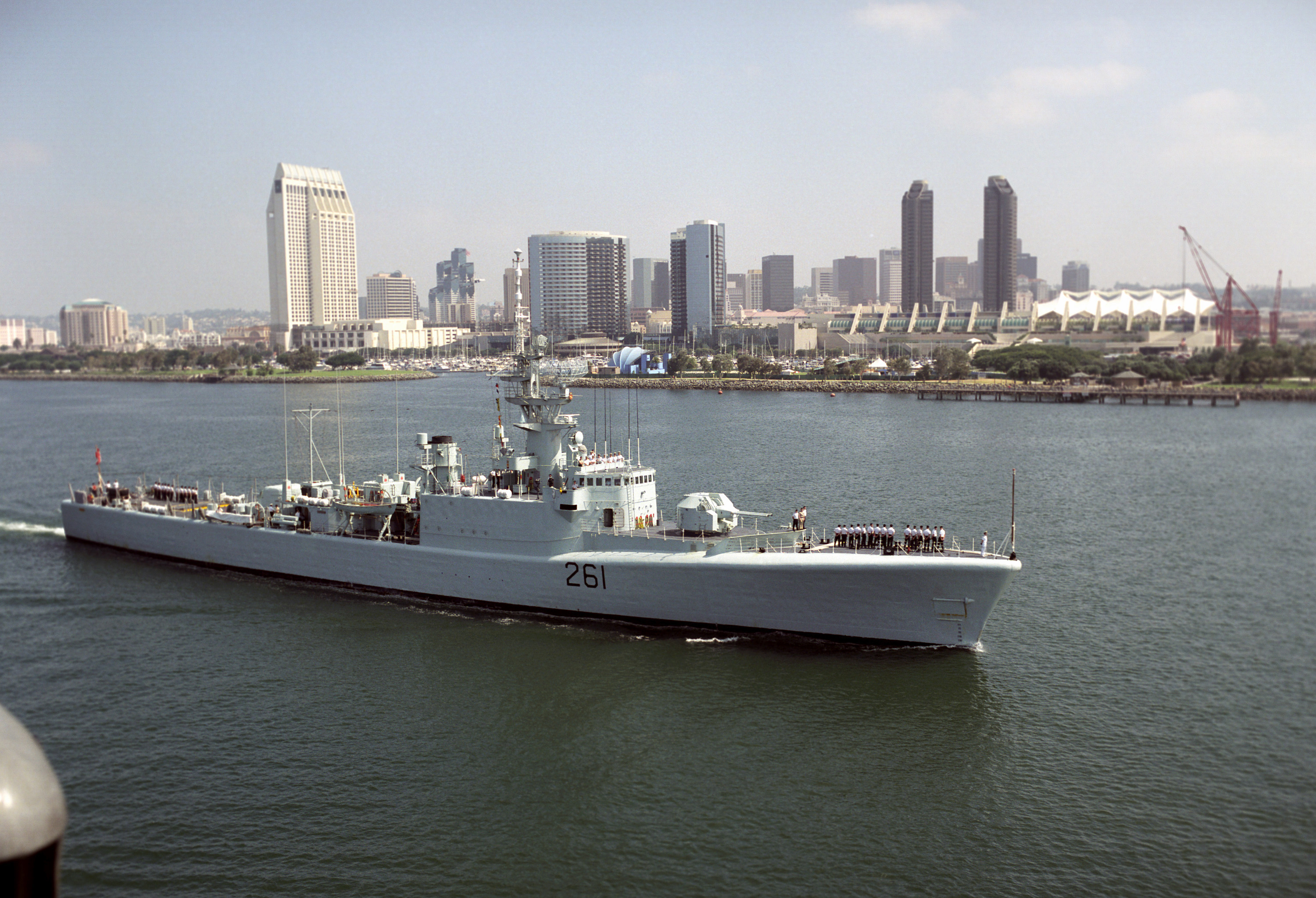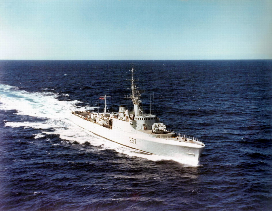 Here's HMCS Restigouche at sea with the staffs down and here's HMCS Mackenzie in San Diego harbour with the staffs mounted. The Junior Officer all in white is standing where I was in Auckland. He's lucky this picture was taken in the summertime.