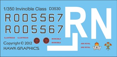 Includes markings for the Modern Invincible Carriers, Illustrious, Invincible, and Ark Royal. Also includes the missing deck letter for the Airfix Illustrious kit.