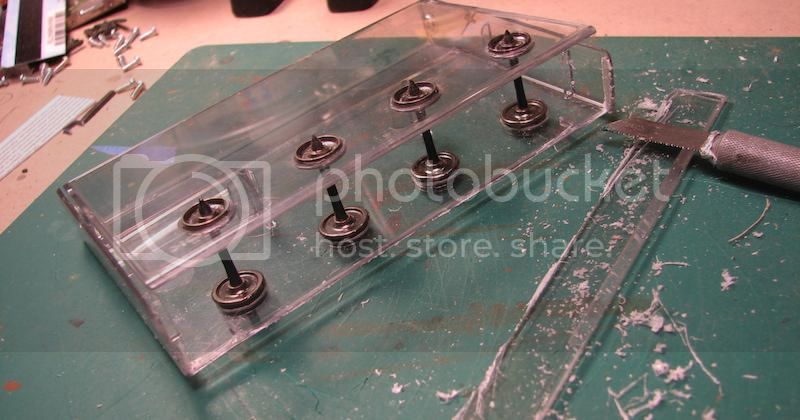 My other project is a very simple one to make. All I did was take an old rechargeable can opener and removed the cutting arm. Then all I did was add some double sided tape to the wheel. Now all I have to do is place my road wheel, or any other type of wheel, to the double sided tape, hold the paint brush in place and active the button. The can opener does all of the work for you.