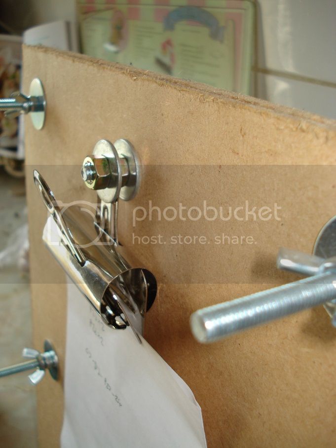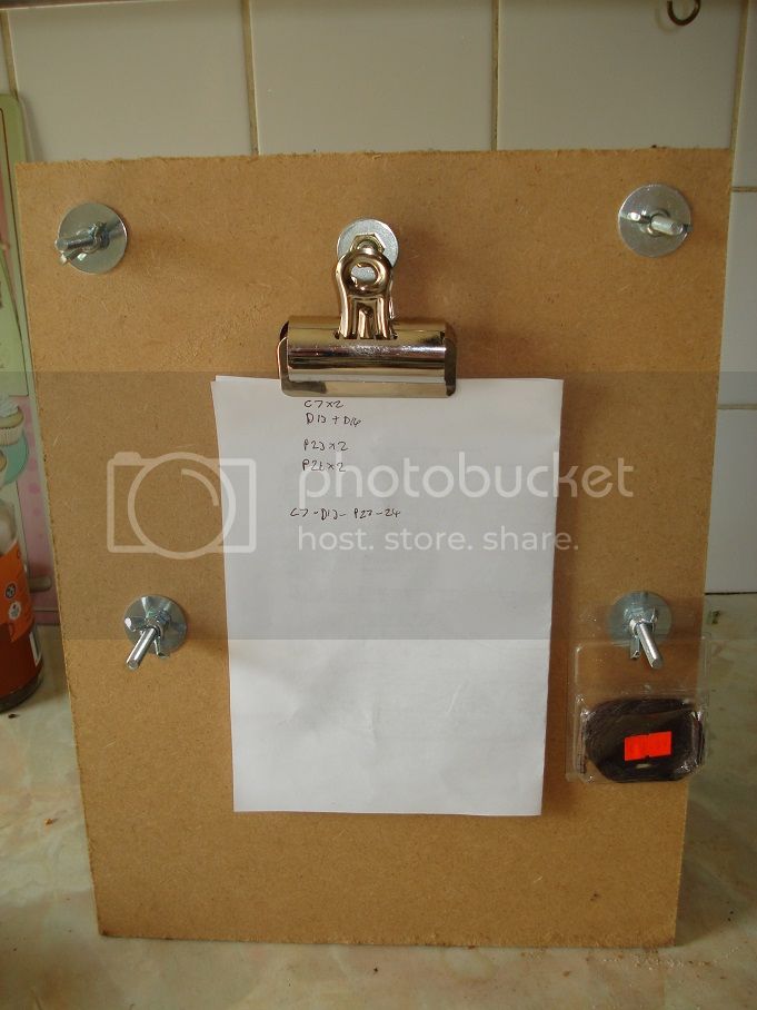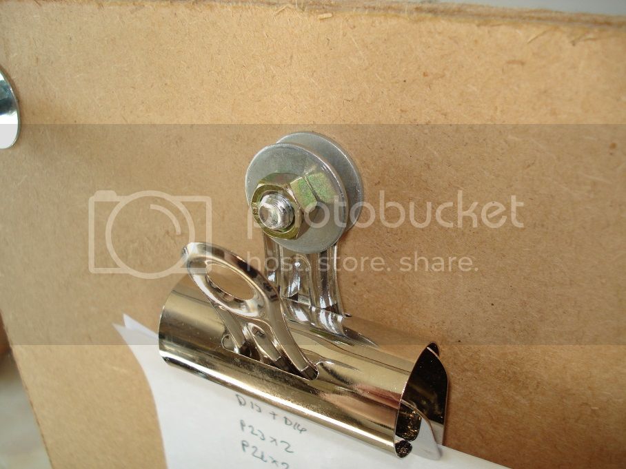 I am using offcuts from my desk as it is around the right size so as it stands it will be.... roughly 13 inches wide by 16 inches high. I will be mounting the clip centrally(a large bulldog type clip) held on by a large washer, nuts and bolt. The 4 bolts to hold the bits will be 6mm and attached in a similar fashion with a wing nut used to retain the packets. I will post some pics later in the weekend as I don't expect it to take too long to build.