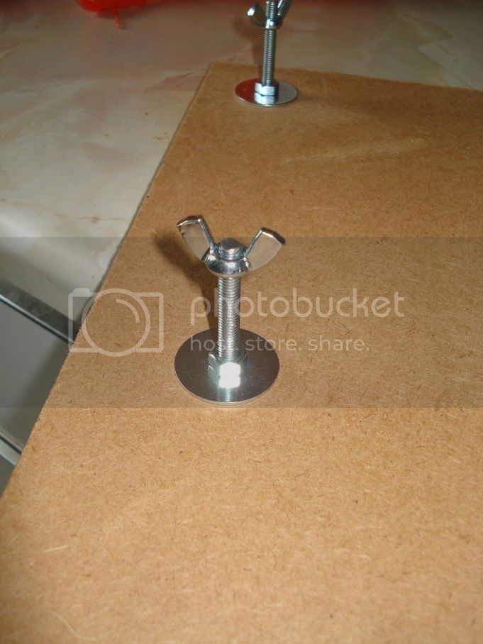Fixings, holes having been drilled earlier. I added a second piece of MDF at the rear to allow me to recess the set screws.