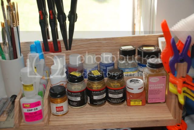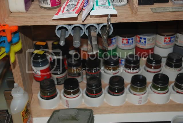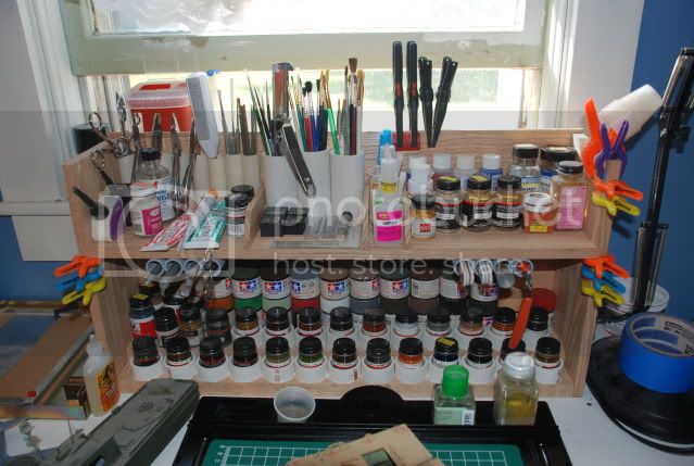 My second project was even more useful, and almost as simple to build. It is a paint stand, tool stand, glue and everything stand that takes up about 6 inches in depth of space, by about 2 feet. Its 18 inches high. 20 dollars at local hardware store paid for it all with some pieces of leftover pvc rounding it out. Unfortunately I did not take in progress pics, but its come in quite handy. One 6 foot piece of half in oak and a couple of pieces of quarter inch oak make the frame.