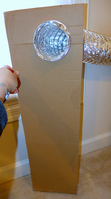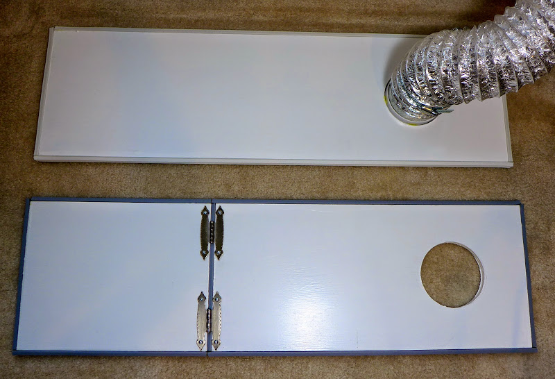 I'm going to build a replacement wood exhaust vent plate for my spray booth. I vent the hood through a dryer duct and out the window of the upstairs room I use. Since I can't leave it in place permanently, I'm currently using a cardboard piece to hold the duct and help block out the elements whenever I airbrush. Needless to say, it's not optimal. Here's what the current setup looks like (next to the window I use it in).