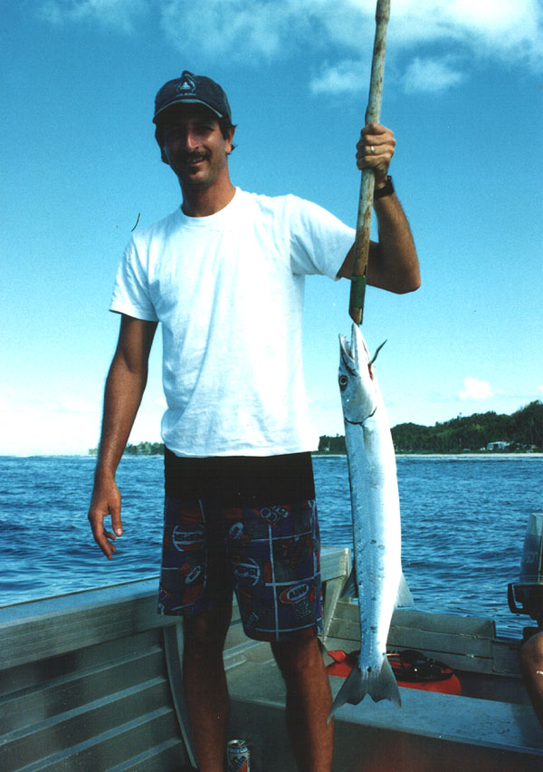 This was our biggest catch that day. We had a blast and the Nauruans must have found us really entertaining - because they joined in too. This fish swims so fast we were amazed. We tried to rig our poles to snag a Tuna but the Nauruans wouldn't really let us get serious about it. Later we learned that the Tuna out there were true monsters. They swam so fast that they'd certainly snap any line we got far enough down to interfere with 'em - or worse yet - they'd capsize the little boats we were messing around on if snagged.
