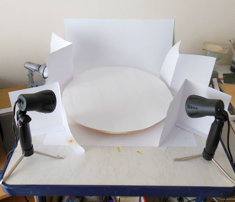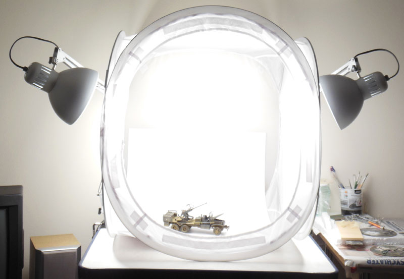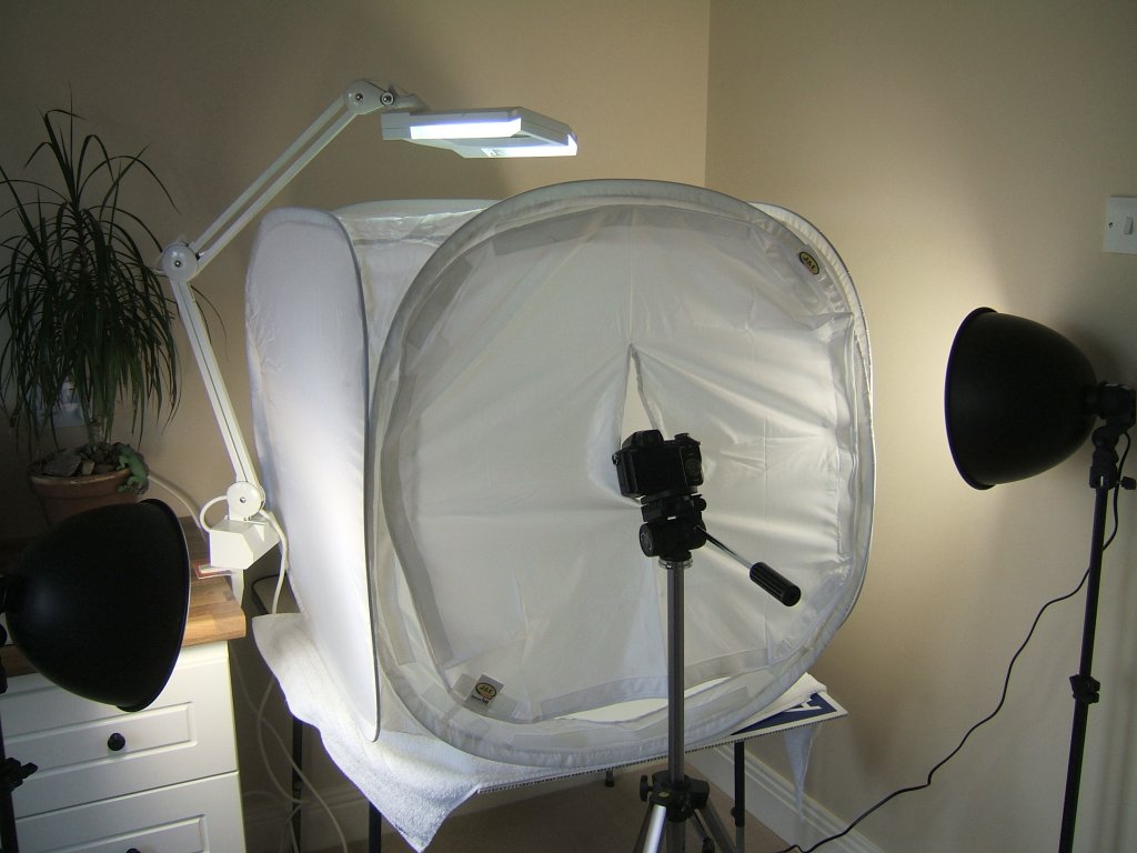 An alternate setup is "simulated sun" with a single light source set up above/to the side of the kit. Totally different aims and that works with a light box (Starts at 60€). There you will get (and want) shadows. This is a lamp mounted in a reflector and behind a white diffusor. Versions that use a flash also exist.