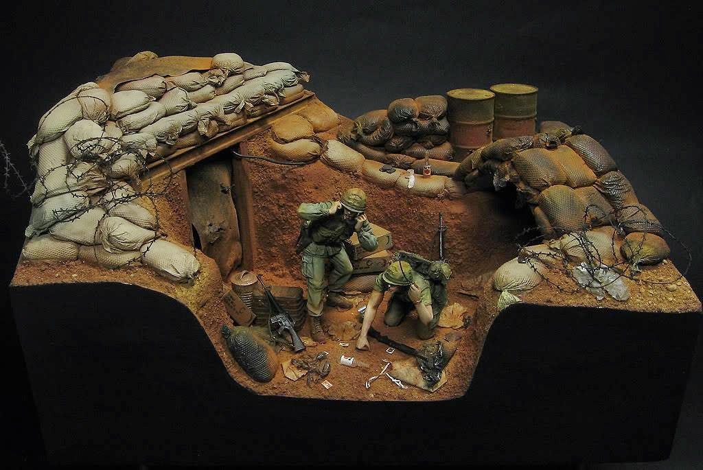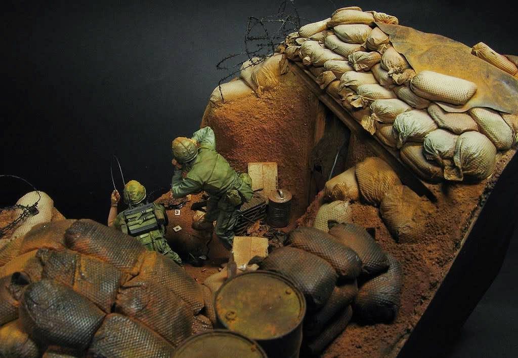 It's a beautiful diorama, but point in fact, the sandbag material used in 'Nam, and later was made from woven nylon strip, in a fine mesh pattern and it was green in color. The mesh pattern would be almost invisible in 1/35 scale, but I have to agree, the artwork of the diorama is fabulous and certainly relays the effect well. I make my sanbages out of Milliput, rolled and formed into a "snake" and flattened on one end, pinched into a narrow opening on the other, if I want texture I press a wet metal screen into it-- which keeps it from sticking. That said, I recently found a pretty good representation from Pegasus models, who makes a bag of 100 ready made resin sandbags for "wargaming" in 1/35 scale-- they look pretty close without the trouble of making them, they use about five different representations, so they don't all look alike, and they have a fine "fabric mesh" texture. You might see if you can find these-- I think Stevens International carries them.