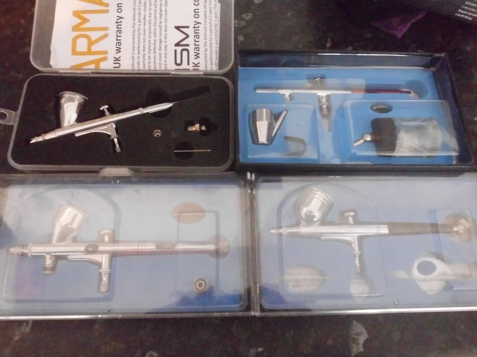 Selling my compressor comes with 4 airbrushes,also job lot of paints mix of Mig ammo and Vallejo,plus about 10 bottles of weathering products,plus a couple of bottles of decal soft and brushes.