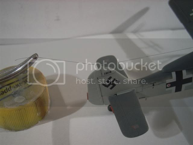it looks like i need to do some subtle touching up just like you said, mal. almost the last job is to get the antennae on to the rudder, what i do is grab the fishing line with lockable forceps, use a bottle top to adjust the height, then move them to "catch" partway around the little post, superglue it, then leave it overnight
