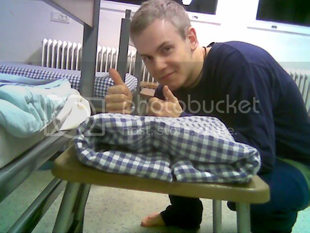 I haven't posted any pics yet, but that changes now! Here's roommate of mine, posing behind his hastily folded bedspread.