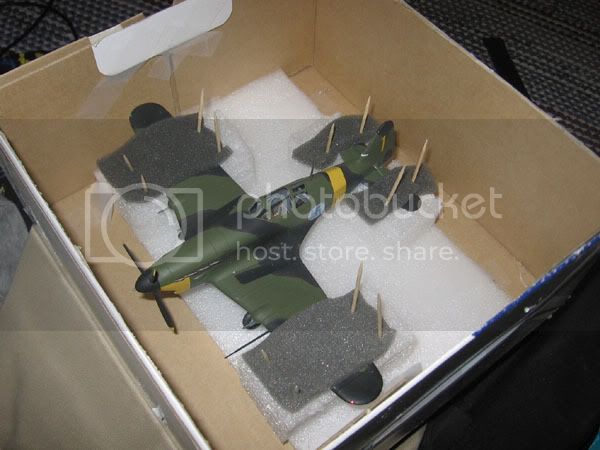 I first cut a piece of packing foam that fitted inside the box (styrofoam should work as well). Then I cut blocks of the same material, to which the model is attached. Position the blocks so that they will be under the wings and horizontal stabilizers. Finally, the model was fixed in place with toothpicks and strips cut from the packing material found in Games workshop blister packs. (of course, other materials can be used too)