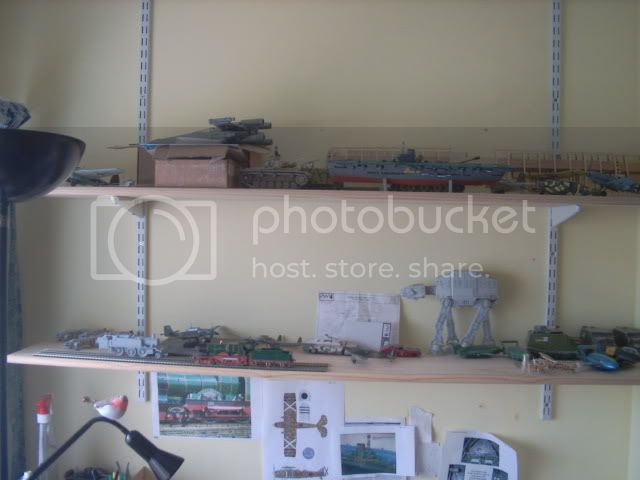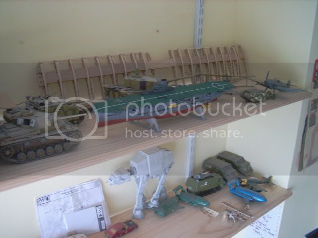 great idea for a thread! here is the shelves above where i build my stuff, my finished and better built kits are in a glass fronted cabinet downstairs. i see you and me share a liking for star wars kits too!