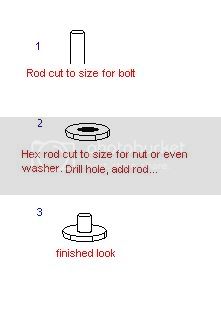 Nuts & Bolts, I like to cut mine from Evergreen Plastic rods. They come in many shapes and in hex shapes and sizes. Again with a little practice you’ll achieve great results.