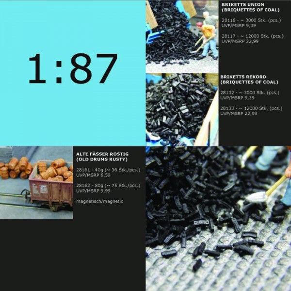 Juweela has released a good mix of products in a large number of scales, this time around Juweela has released news of coal briquettes in 1/45th and 1/87th scale and in a selection of quantities. Also in this 1/87th scale is a selection of old and dented oil drums that are also available in a mix of quantities.