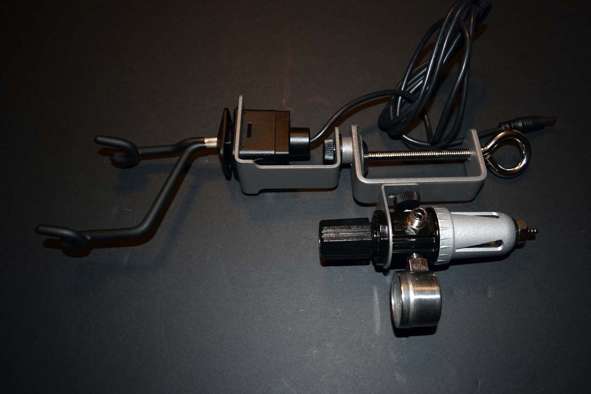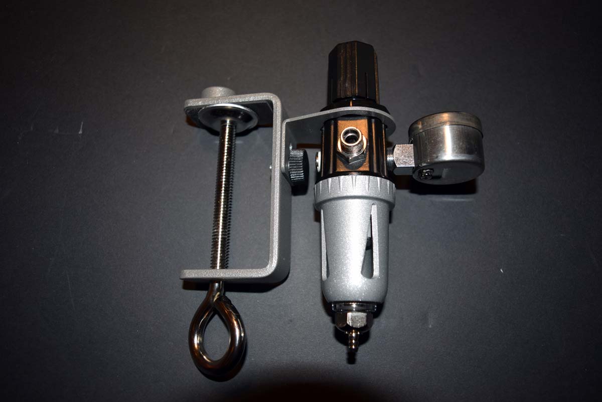 In the box you will find a surprising number of parts; the moisture trap is provided attached to the clamp for attaching it to a table or even the body of the compressor. The smart stop switch is also in the top box and this has a bolt that attaches it to the clamp and moisture trap. The last part of this area is the airbrush hanger that stops and starts the compressor; the frame is metal that has been covered with a rubber using a method that I am unfamiliar with. The wire for shutting down the compressor runs from the bottom of the smart stop switch and plugs straight into the compressor without any issues regarding fit. On the top of the moisture trap is a lift and turn knob for adjusting the air pressure to an airbrush can be adjusted as required the gauge attached goes up to 100 PSI but something is very wrong if it gets that high. The moisture container is protected by a screwed on metal cover with vision slots cut into it, a nice inclusion for protecting an area that could be easily broken if someone is careless.