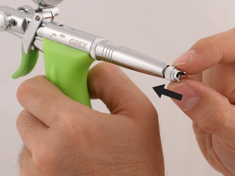 The nozzle cap and fluid nozzle are screw-in types. You can choose 0.2mm, 0.3mm, or 0.5mm spray nozzles for the Tritium.